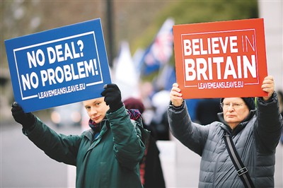 英國(guó)議會(huì)下院就“脫歐”協(xié)議草案進(jìn)行表決的時(shí)間已經(jīng)從2018年12月推遲到2019年1月,“脫歐”前景依然不明。圖為1月7日,支持英國(guó)“硬脫歐”的人士在英國(guó)首都倫敦的議會(huì)大廈外揮舞標(biāo)語(yǔ)。(新華社 蒂姆·愛(ài)爾蘭 攝) |