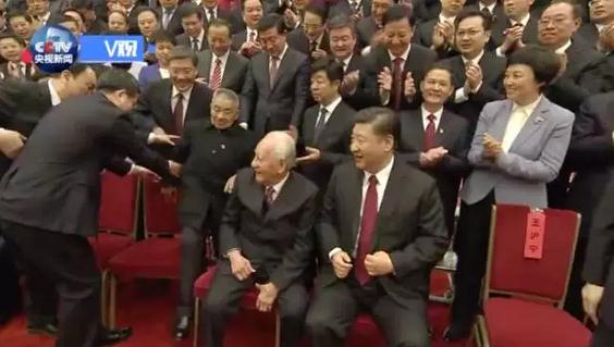做夢(mèng)也沒(méi)想到,習(xí)總書記竟然會(huì)把我請(qǐng)下來(lái),坐在他旁邊,而且還把板凳給我拉過(guò)來(lái),叫我坐下來(lái)……我激動(dòng)得一時(shí)也不曉得要講什么話。尊重科學(xué),尊重科技人員,尊重老人,今天給我的印象特別深。