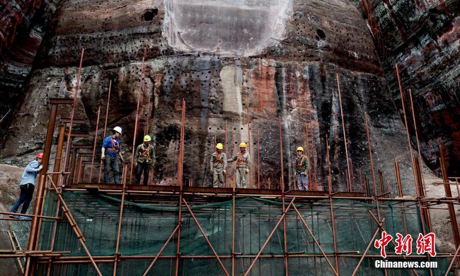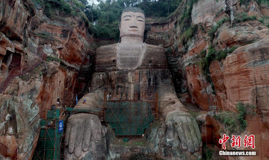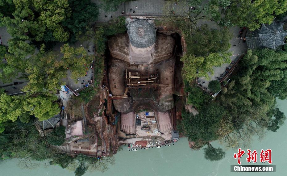 空中俯瞰大佛腳手架拆除作業(yè)現(xiàn)場(chǎng)。劉忠俊 攝