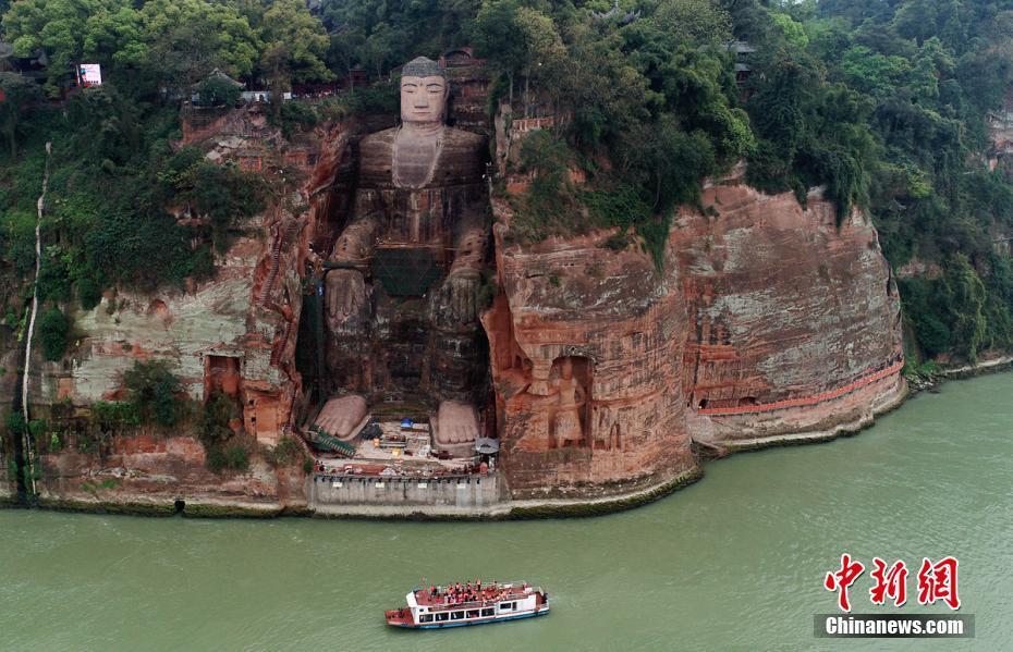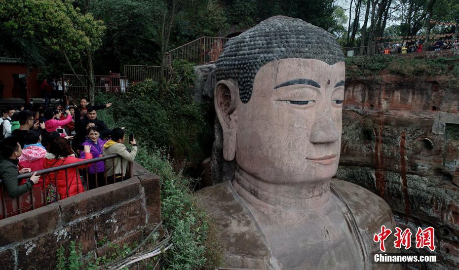 記者在現(xiàn)場(chǎng)看到,樂山大佛的“花臉”已被“清洗”干凈,重露新顏,吸引了不少游客拍照。樂山大佛右側(cè)懸崖邊,有一條險(xiǎn)峻的棧道自上而下盤旋至大佛腳下,這就是“九曲棧道”,通過棧道可以去“抱佛腳”。劉忠俊 攝