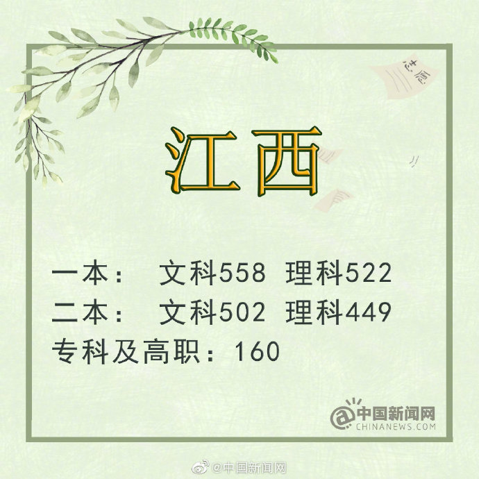 6月23日,江西省2019年高考分?jǐn)?shù)線公布:第一批本科文史類558分、理工類522分;第二批本科文史類502分、理工類449分;文史、理工類高職(???:160分。