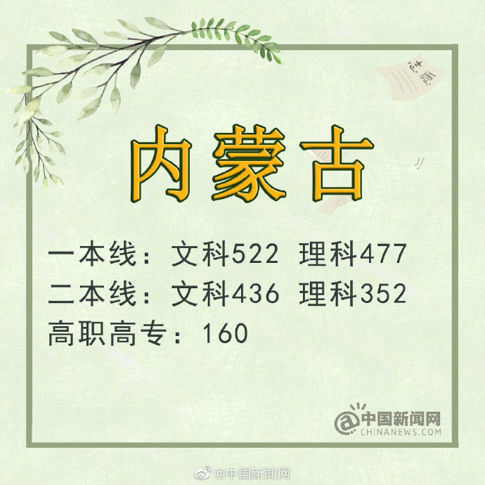 據(jù)內(nèi)蒙古招生考試信息網(wǎng)網(wǎng)站消息,6月23日,2019年內(nèi)蒙古高考分?jǐn)?shù)線出爐:普通文科一批522分、二批436分、高職高專160分;普通理科一批477分、二批352分、高職高專160分;蒙授文科一批398分、二批320分、高職高專120分;蒙授理科一批348分、二批274分、高職高專120分。