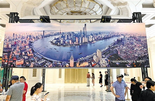 7月2日,在國務(wù)院新聞辦公室舉行的新聞發(fā)布會上,四面環(huán)繞的大屏幕全方位展示了上海的新面貌。本報記者 祝君壁攝