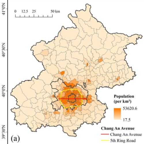 圖為2010年北京人口密度分布圖,來源Assessing Heat Health Risk for Sustainability in Beijing’s Urban Heat Island