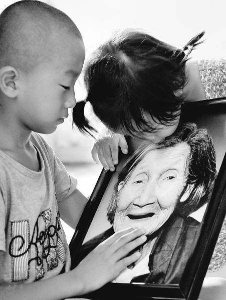 麒麟手捧遺像呆呆坐在門前。一個(gè)扎著小辮的4歲小女孩跑過來,在老人遺像的額上輕輕一吻。遺像是麒麟周歲生日時(shí)照的,好心的市民買來了蛋糕,老人咧著無牙的嘴,笑得很開心。